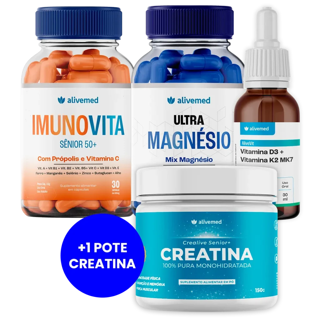 Kit com 1 ImunoVita + 1 UltraMagnésio + 1 AliveVit D3+K2 + 1 Crealive Senior