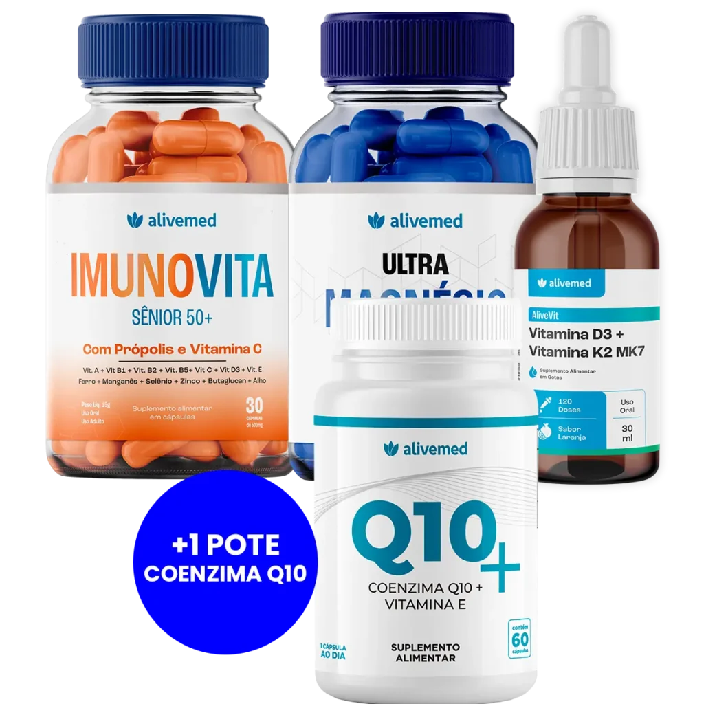 Kit com 1 ImunoVita + 1 UltraMagnésio + 1 AliveVit D3+K2 + 1 Q10+